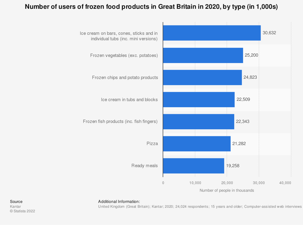 在英国,全国售出了超过22亿份冷冻食品。该年冷冻食品零售总额约为72.1亿英镑。在用户方面,冰淇淋是英国最受欢迎的产品,共有约3060万消费者,其次是冷冻蔬菜,有2520万消费者。根据YouGov品牌指数,英国领先的冷藏和冷冻食品品牌是Cathedral City (Buzz得分7.7),Qyorn(6.4)和Lurpark(5.8)。