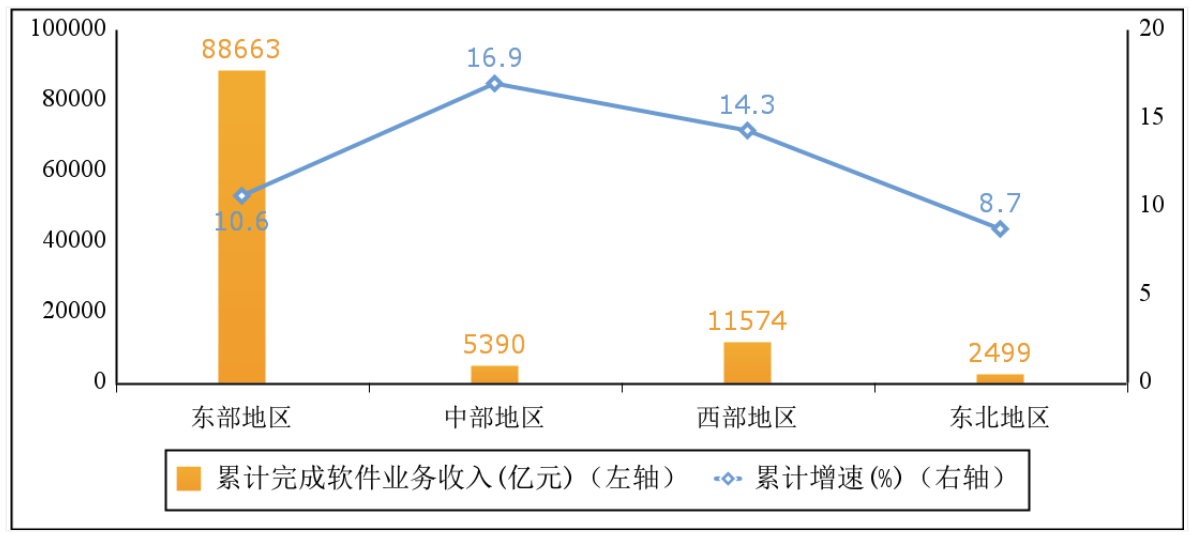 东部地区保持较快增长,中、西部地区增势突出。2022 年,东部、中部、西部和东北地区分别完成软件业务收入 88663 亿元、5390 亿元、11574 亿元和 2499 亿元,分别同比增长 10.6%、16.9%、14.3% 和 8.7%。其中,中部、西部地区高出全国平均水平 5.7、3.1 个百分点。四个地区软件业务收入在全国总收入中的占比分别为 82.0%、5.0%、10.7% 和 2.3%。