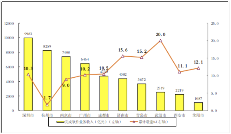 中心城市软件业务收入稳步增长,利润总额增速小幅回落。2022 年,全国 15 个副省级中心城市实现软件业务收入 53419 亿元,同比增长 10.0%,增速较上年同期回落 6.3 个百分点,占全国软件业的比重为 49.4%;实现利润总额 6924 亿元,同比增长 2.4%,增速较上年同期回落 2.1 个百分点。其中,武汉、宁波、济南、青岛和沈阳软件业务收入同比增速超过全行业整体水平。