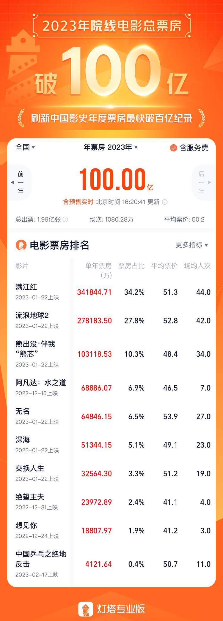 灯塔专业版数据显示,截至 1 月 ,2023 年度大盘票房 (含预售) 突破 100 亿元,刷新中国电影市场年票房最快破 100 亿纪录。截至目前,2023 年实时票房前三名为《满江红》《流浪地球 2》《熊出没・伴我“熊芯”》。前十位具体如下: