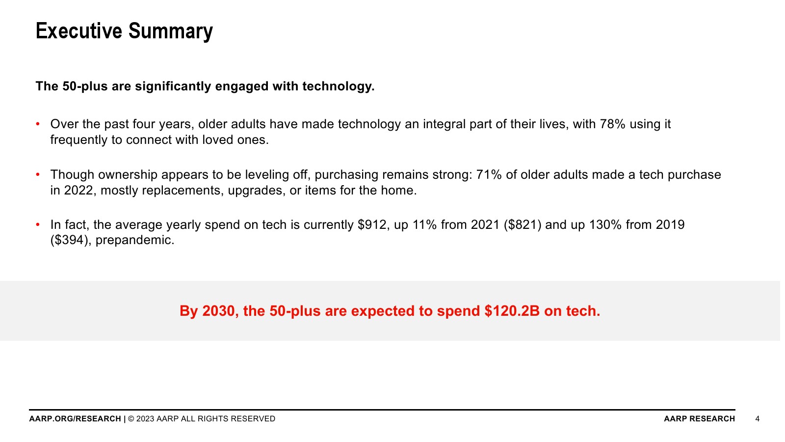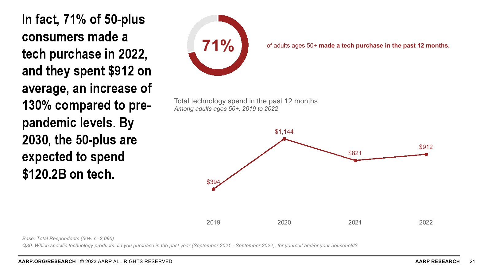 目前,老年人每年在科技方面的平均支出为 912 美元,比 2021 年(821 美元)增长 11%,比大流行前的 2019 年(394 美元)增长 130%。