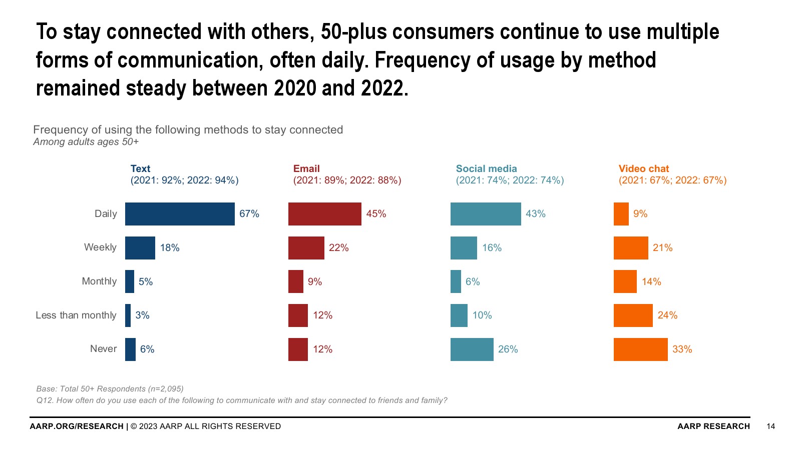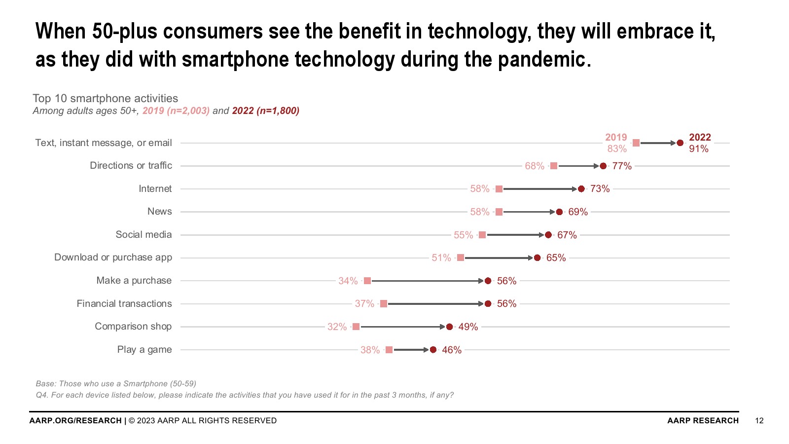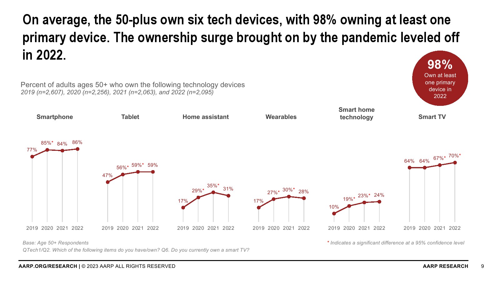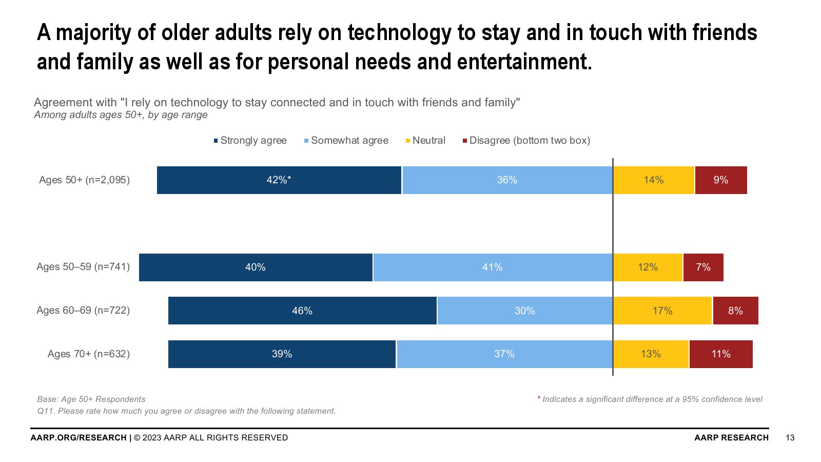 AARP发布了新报告“2023年技术趋势和50岁以上成年人”。50 多岁的人非常热衷于技术。在过去四年,老年人已将技术融入他们的生活,其中 78% 的人经常使用它与亲人联系。
