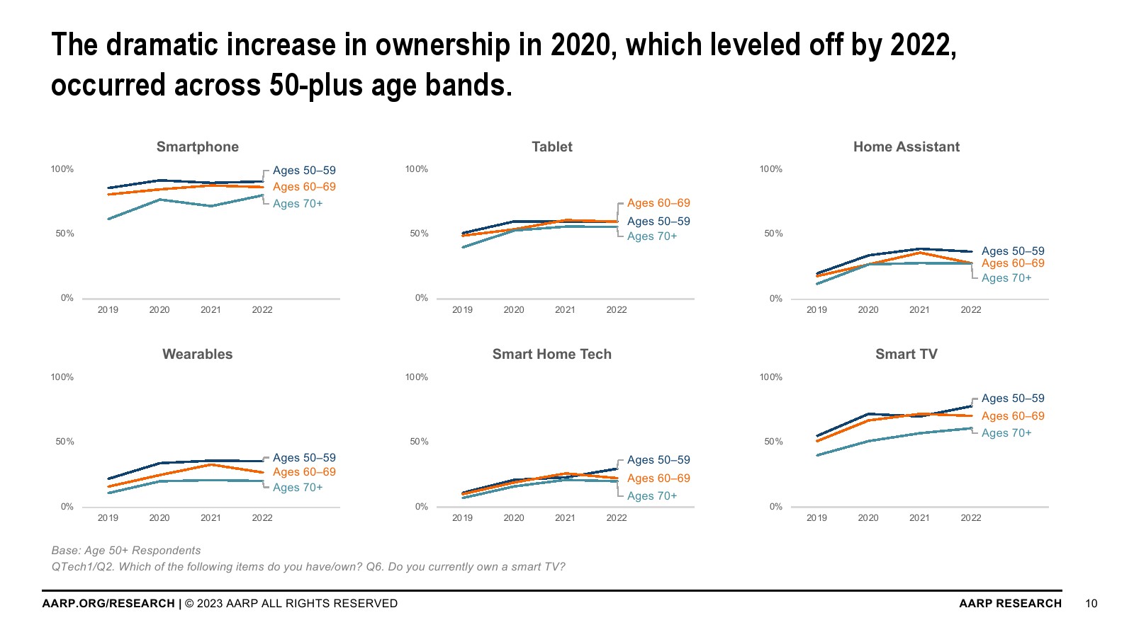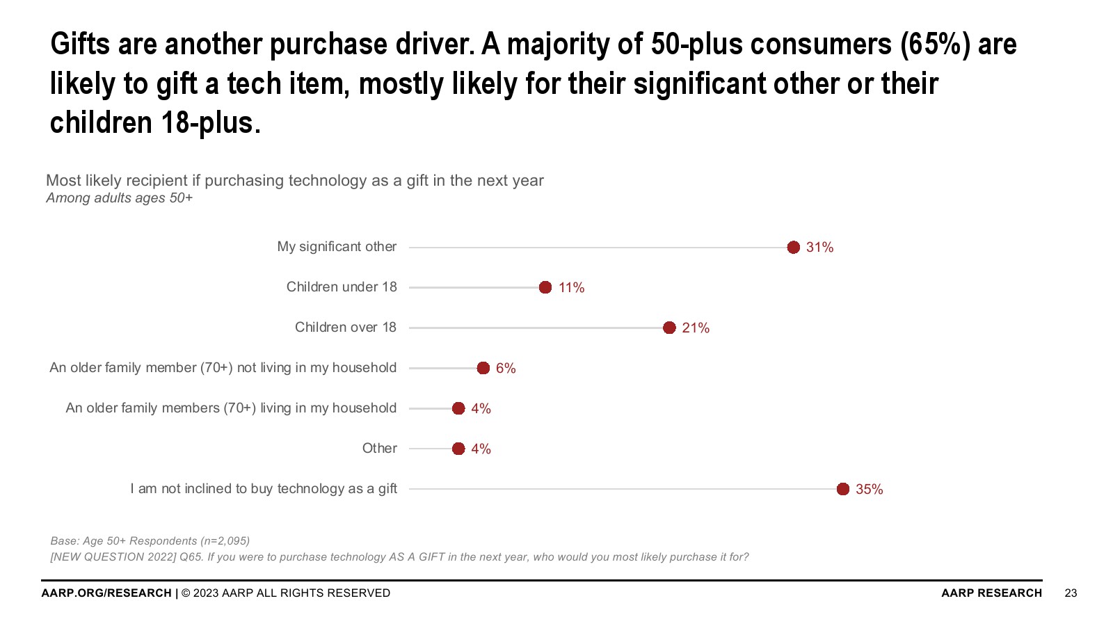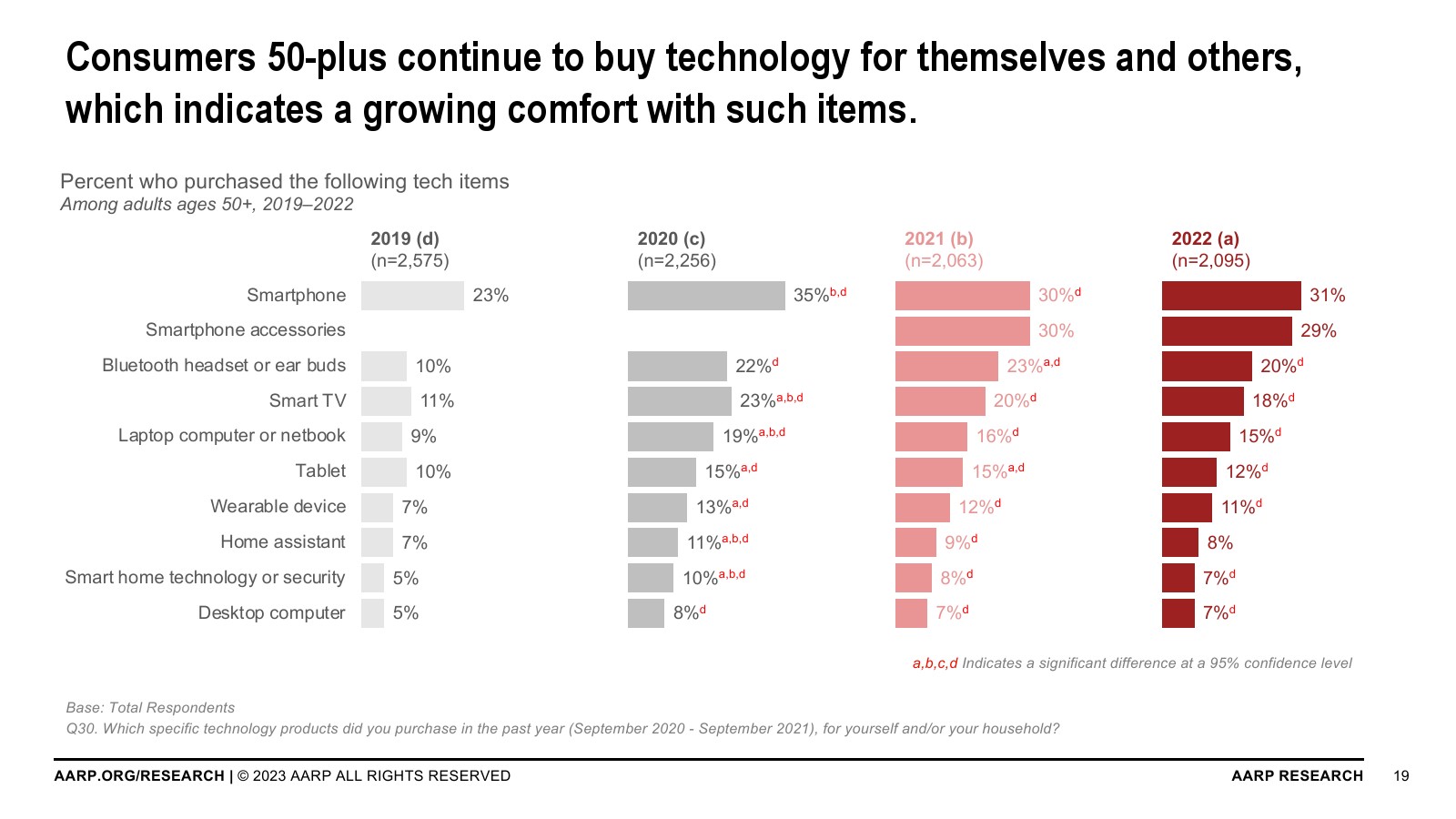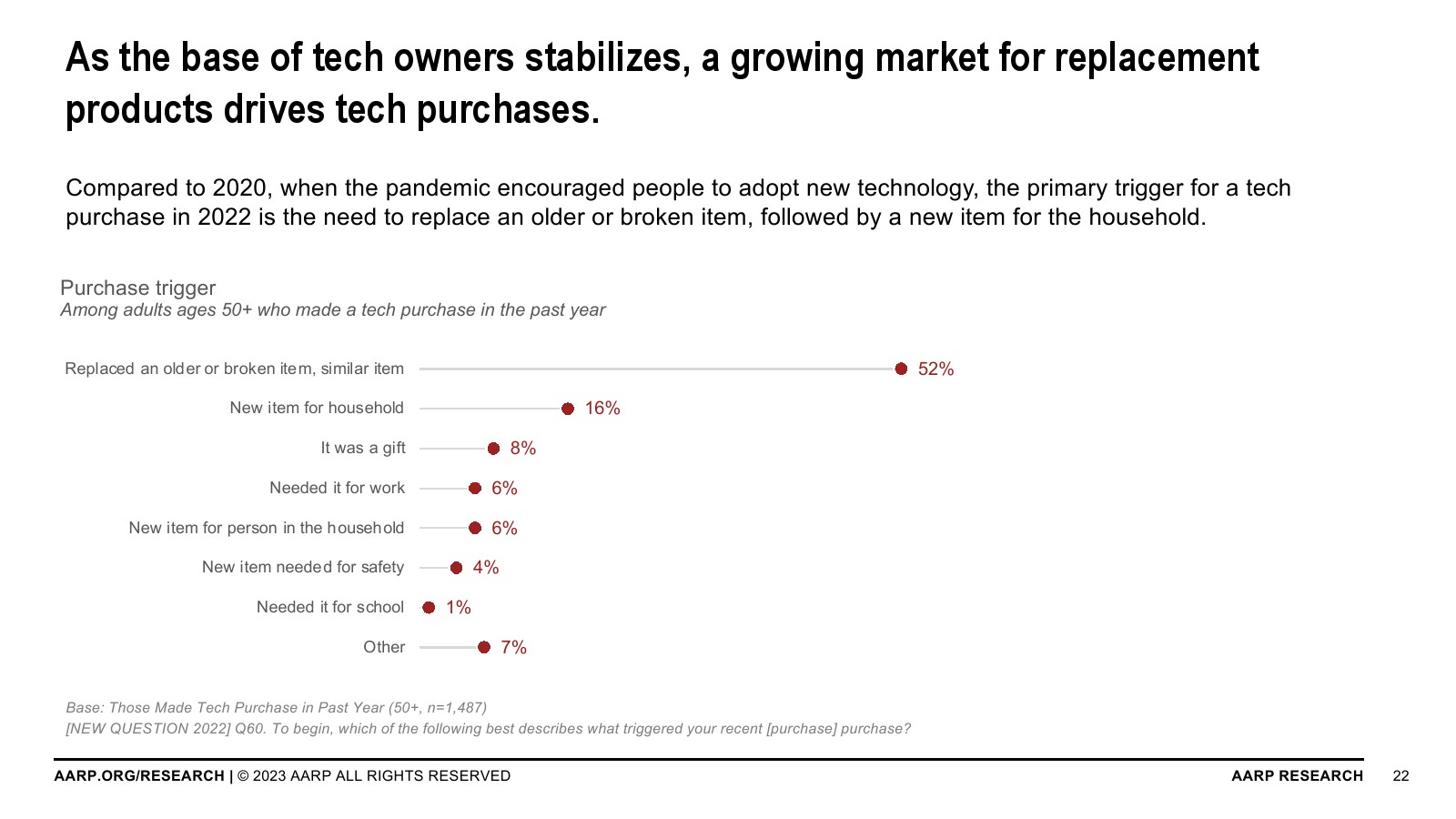 尽管普及度趋于平稳,但购买力依然强劲:71%的老年人在 2022 年购买了科技产品,主要是更换、升级或家居用品