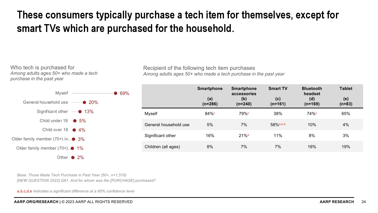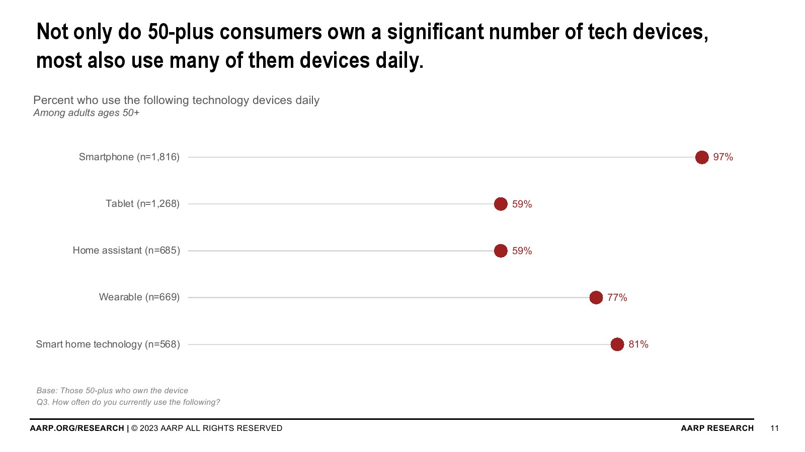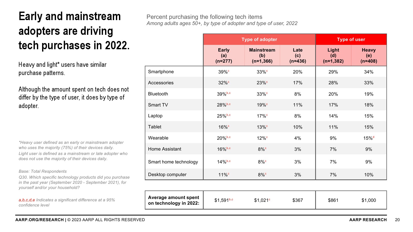 尽管普及度趋于平稳,但购买力依然强劲:71%的老年人在 2022 年购买了科技产品,主要是更换、升级或家居用品
