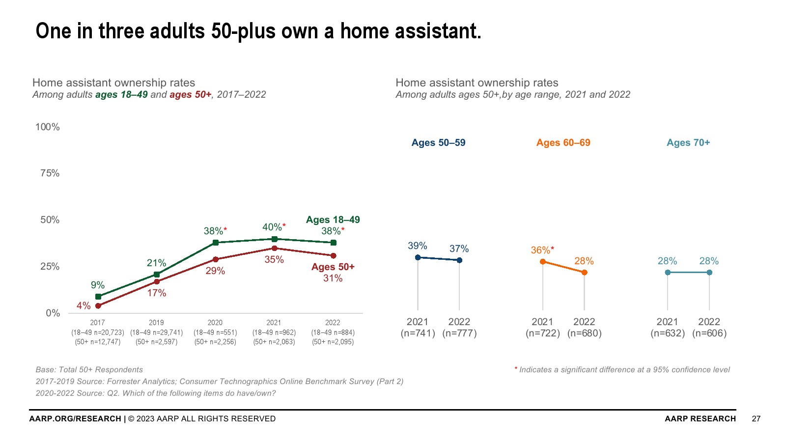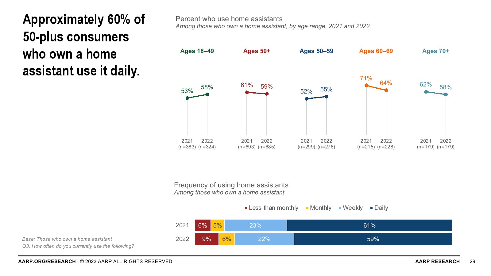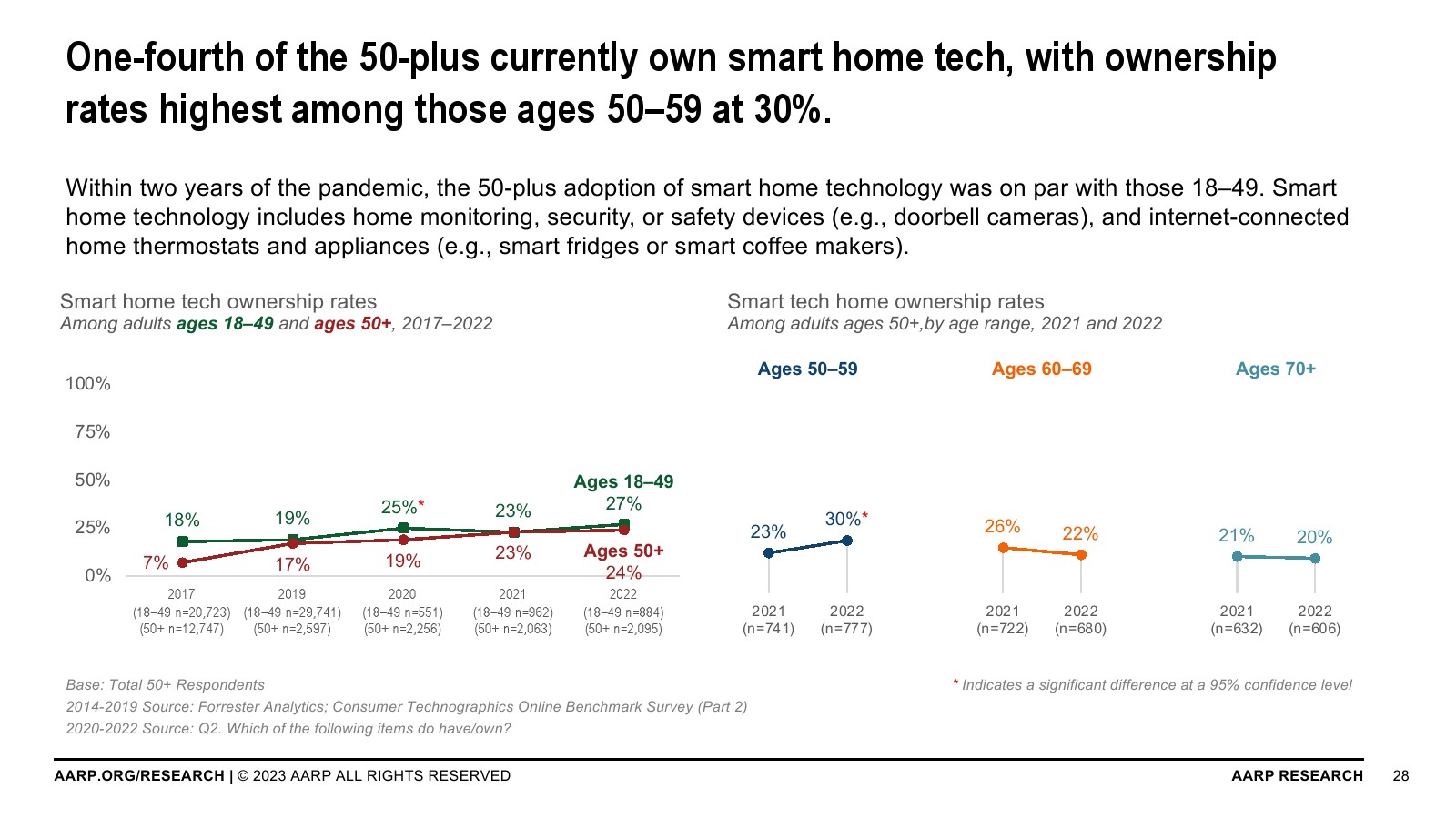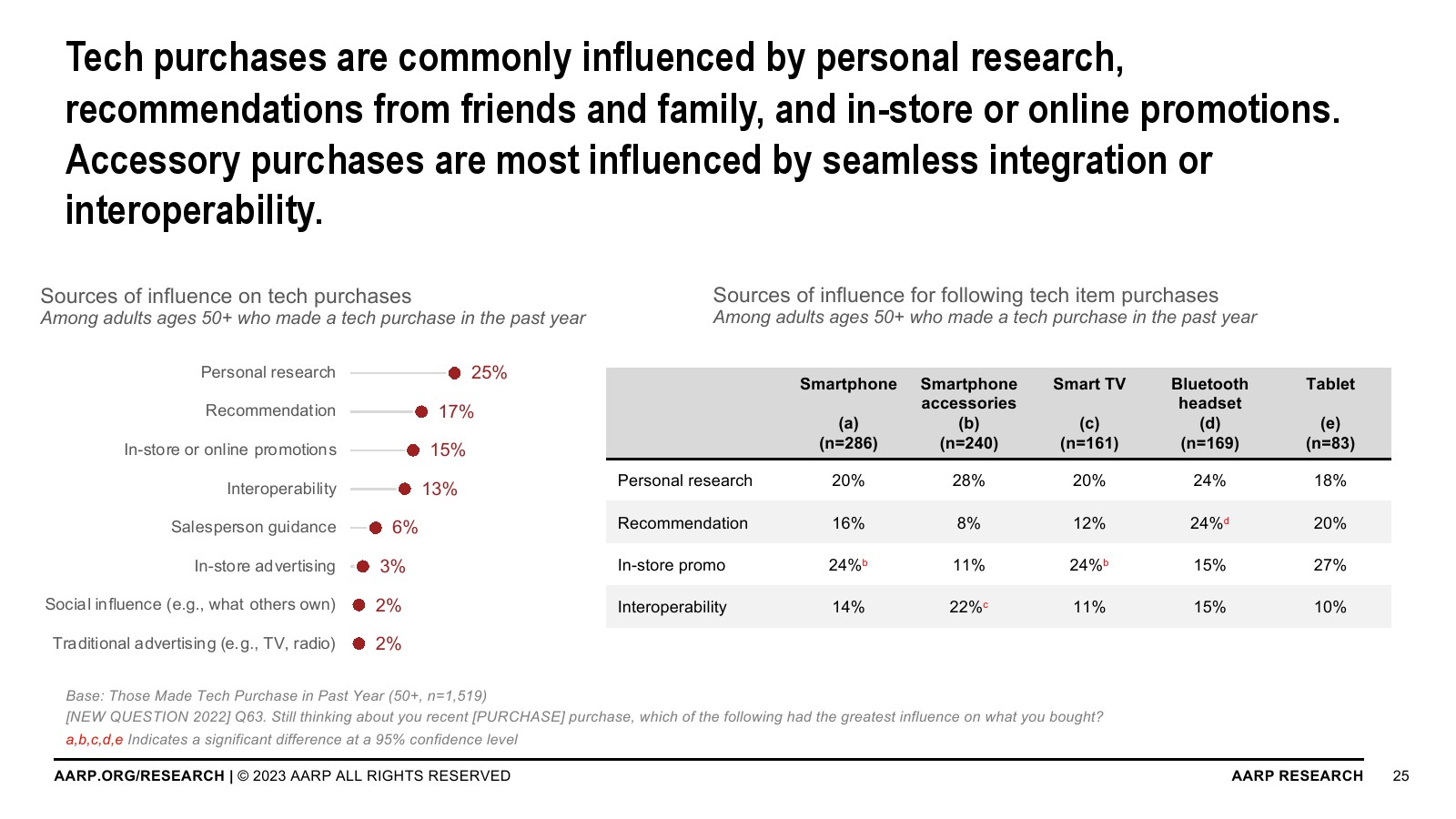 尽管普及度趋于平稳,但购买力依然强劲:71%的老年人在 2022 年购买了科技产品,主要是更换、升级或家居用品