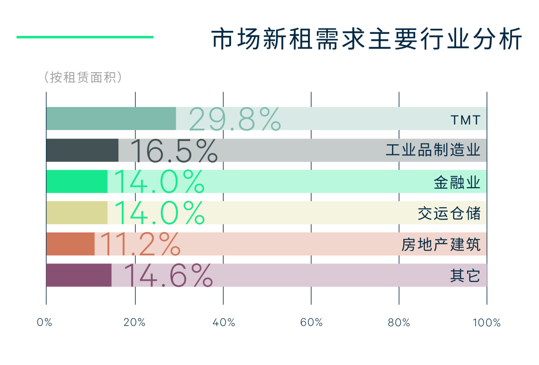 新增需求方面,TMT、工业品制造业、金融业主导去化,分别占比29.8%、16.5%、14.0%。首先,TMT继续领衔需求,占比29.8%,但规模同比收缩0.3个百分点,其中娱乐及传媒、专业服务、物联网类的头部TMT企业录得数笔3,000平方米以上的大面积成交案例;得益于年内重庆市招商引资带来的产业落地成果,工业品制造业占需求比重达16.5%;此外,年内传统金融持续扩张,保险、证券等细分领域的企业表现抢眼,带动需求稳步增长,占比14.0%。