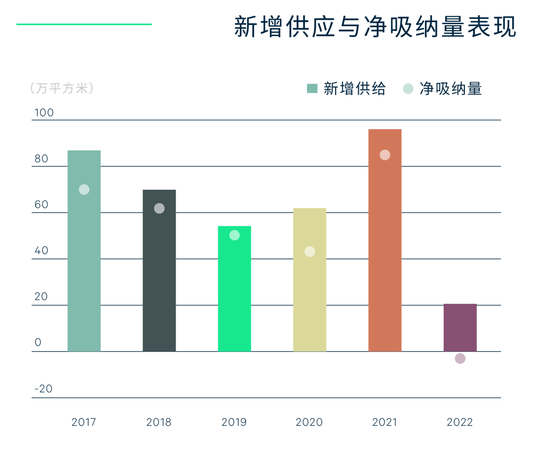 着眼需求端,受全年一系列事件的影响,消费走低,跨省市旅游受阻,以及多个购物中心年内开启大规模调整,共同导致全年吸纳量录得负值。因此,全市购物中心整体空置率较同比上升2个百分点至11.9%;首层平均租金增长承压,同比下跌2%。