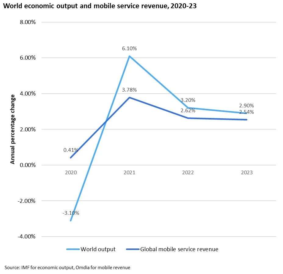 全球经济衰退将给电信市场带来挑战,但人们对电信服务的持续需求将帮助缓解该行业受到的冲击。根据IMF的数据,到2023年,全球经济增长率将从2021年的6.1%降至2.9%。Omdia预测,到2023年,全球移动服务收入增速将从2021年的3.78%降至2.54%。