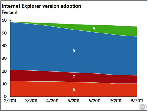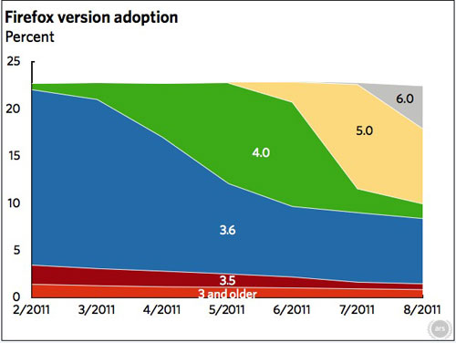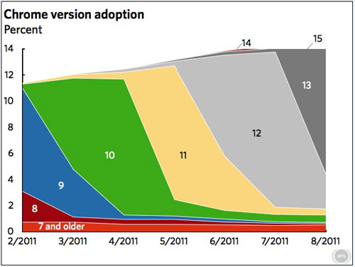 此外,ArsTechnica.com还统计了2011年2月至8月期间Firefox、IE和Chrome的各版本使用情况。结果表明:相当 一部分Firefox用户仍钟情于3.6版;IE 9推广缓慢,绝大多数IE用户仍使用IE 8;而Chrome由于能够自动升级,更新换代十分迅速。