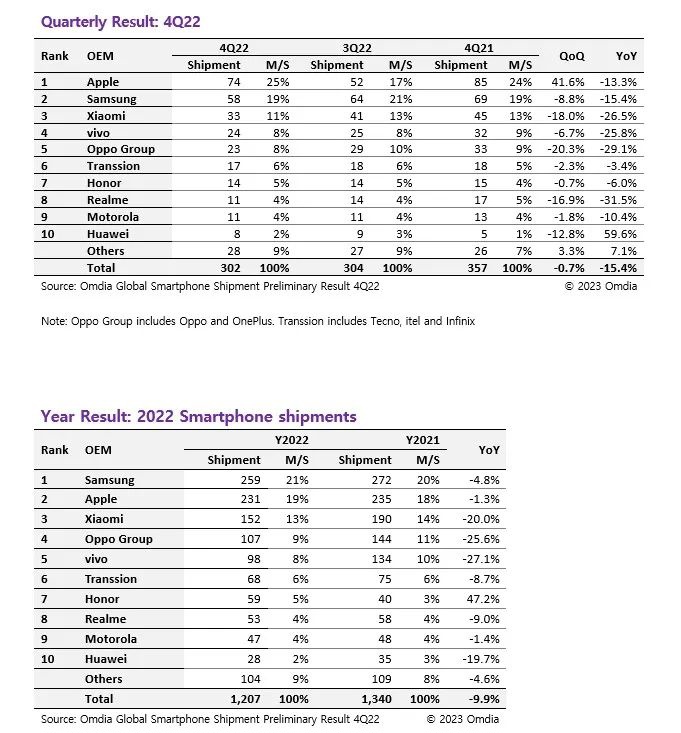 三星,延续惯例,从第一名跌至第二名。尽管这不仅是因为苹果第四季度的增长导致,还因为其自身也同比下降 15.4%,第四季度出货量为 5800 万台,去年同期为 6900 万台。三星季度出货环比下降了 8.8%,第三季度出货为 6400 万。然而,随着其他品牌的同时大幅下滑,其市场份额仍保持稳定。