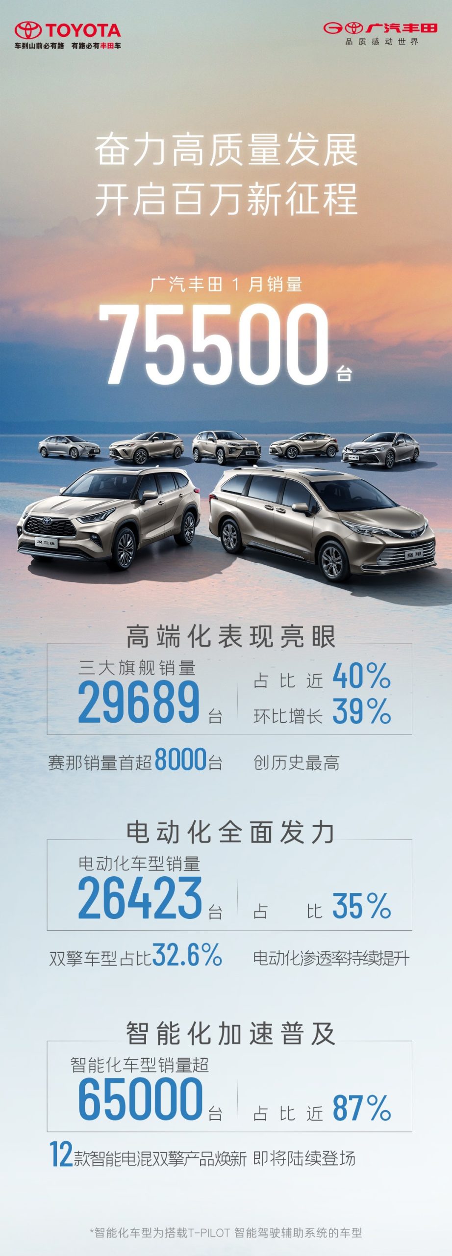 近日消息,广汽丰田 1 月销量 75500 台,三大旗舰销量 29689 台,其中赛那销量 8000 台,创历史最高。电动化车型销量 26423 台,智能化车型销量超 65000 台。