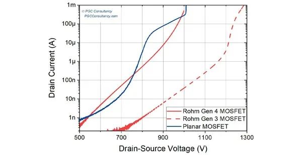 罗姆提出的一项声明涉及将额定电压范围从650 V提高至750 V。罗姆表示:“750 V击穿电压可确保设计裕度不受VDS浪涌影响”。我们发现这是一个正在席卷整个行业的有趣发展。然而,实际上,在静态条件下测试的新型第4代器件的实际击穿电压约为1000 V,实际低于在超过1200 V时击穿的第3代器件。新型第4代器件与一流的平面器件不相上下。结合他们关于裕度的说法和实际数据,这的确令人印象深刻。他们允许以75%的实际击穿电压下使用该器件,该数据高于第3代的50%以上,这表明第4代的可靠性大幅提高。正如我们将在下一节中解释的那样,这种降额的减少是一个很大的改进,可以在一定程度上降低电阻。
