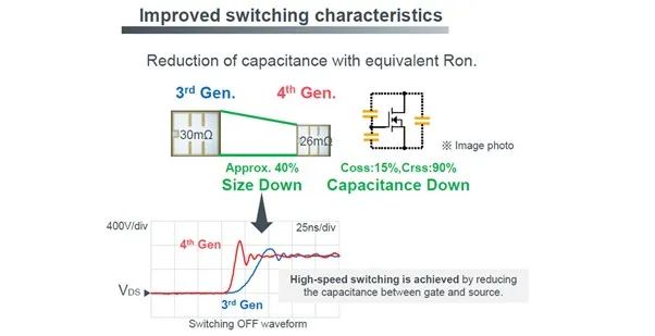 在产品发布声明中,罗姆声称其第4代产品“通过进一步改进原有的双沟槽结构,在不影响短路耐受时间的情况下,使单位面积导通电阻比传统产品降低40%。”他们还表示,“此外,显著降低寄生电容使得开关损耗比我们的上一代碳化硅金氧半场效晶体管降低50%成为可能”。
