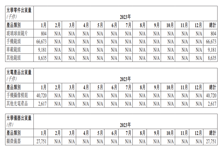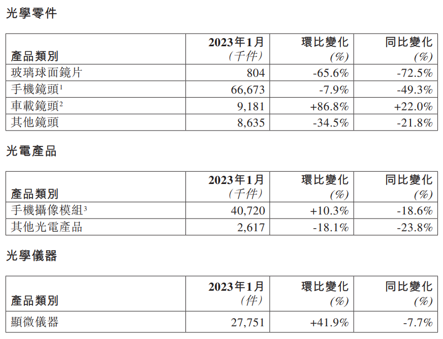 舜宇光学科技近日在港交所发布公告,1 月手机镜头出货量 6667.3 万件,同比下降 49.3%;手机摄像模组出货量 4072 万件,同比下降 18.6%;车载镜头出货量 918.1 万件,同比增长 22.0%。