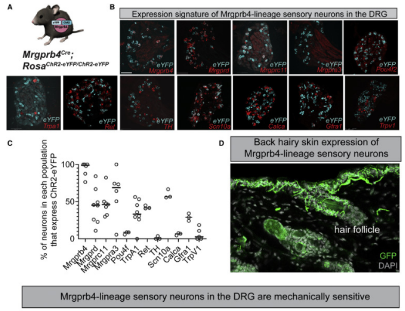 为了探索不同神经元类群的功能,研究人员采用原位杂交和免疫荧光技术,对具有不同分子标志物的小鼠神经细胞类群进行改造,再用特定颜色的光将其激活。使用急性分离的神经元完整细胞膜片钳法进行记录,研究人员评估了Mrgprb4谱系接触神经元的机械敏感性。