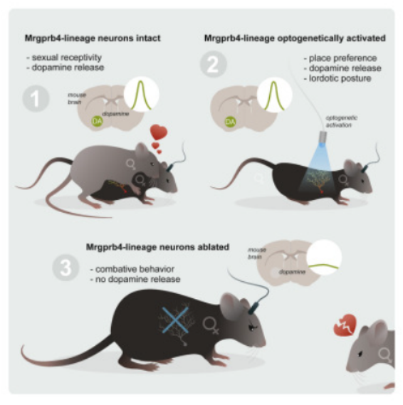 研究人员发现,一旦Mrgprb4神经元被特异性激活就会唤起雌鼠的特殊姿势。有趣的是,同一批小鼠事后还会主动前往曾被光照激活神经的位置,也就是说,背部Mrgprb4细胞被激活对于它们来说是一种美好的体验。