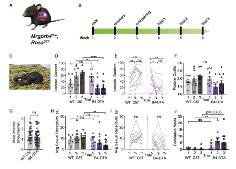 结果发现雌鼠背部皮肤的Mrgprb4细胞被消除后,它们对雄鼠的接纳程度急剧下降。也就是说,当触觉环路中缺少Mrgprb4细胞,即便雄鼠通过轻柔的触碰反复试探,雌鼠也无动于衷。