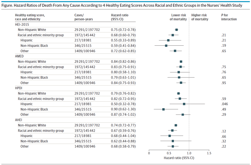 图注:“护士健康研究”中4种不同种族和民族健康饮食评分的死亡危险比。(来源:Shan Z., et al. 2023)