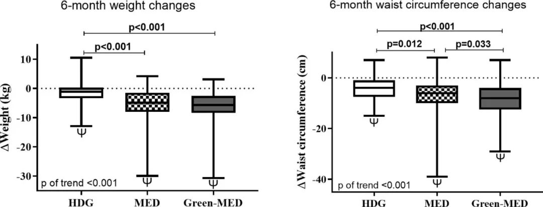 三个饮食组的体重和腰围变化(图片来源:Heart)