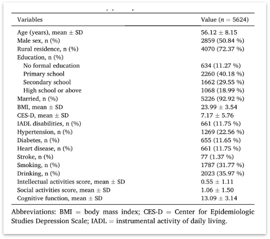 该研究依托中国健康与养老追踪调查(CHARLS),CHARLS是一项队列研究,旨在收集一套代表中国45岁及以上中老年人家庭和个人的高质量微观数据,以满足老年科学研究的需求。研究人员阐明了休闲活动在预防认知能力下降方面的作用,并探索不同休闲活动与认知功能之间关系。