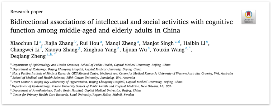 [1] Li X, Zhang J, Hou R, et al. Bidirectional associations of intellectual and social activities with cognitive function among middle-aged and elderly adults in China. J Affect Disord. 2022 Dec 15;319:83-89.
