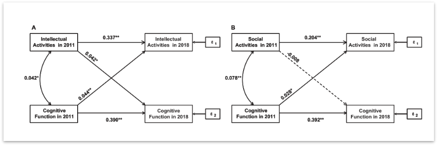 图2:智力/社交活动与认知功能之间的交叉滞后分析结果(来源[1])
