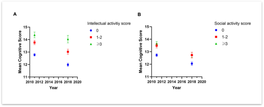 接下来,研究者进一步探究了不同得分智力活动和社交活动的组别认知功能下降的速度。结果发现,2011年-2018年为期7年的随访中,与智力活动得分为0分和智力活动得分为1-2分的组别相比,智力活动得分为3分或更高的组别的认知功能下降速度较慢。社交活动的组别间认知功能下降速度差异不明显,并且社交活动得分在3分及以上的组别似乎认知功能下降得更快。划重点!这些结果表明,参与智力活动有助于延缓认知功能下降,参与社交活动并不能减缓认知功能的衰退!