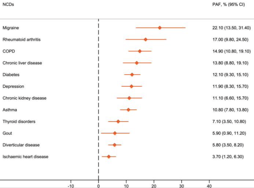 果然,坐得时间越长,患的疾病越多!与几乎不久坐的参与者相比,久坐>6小时/天与12种非传染性慢性病的更高风险有关,包括:偏头痛、类风湿性关节炎、慢性阻塞性肺疾病(COPD)、慢性肝脏疾病(CLD)、糖尿病、抑郁症、慢性肾脏疾病(CKD)、哮喘、甲状腺疾病、痛风、憩室病和缺血性心脏病(IHD)。