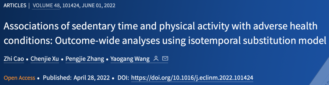 [1]Cao Z, Xu C, Zhang P, Wang Y. Associations of sedentary time and physical activity with adverse health conditions: Outcome-wide analyses using isotemporal substitution model. EClinicalMedicine. 2022 Apr 28;48:101424. doi: 10.1016/j.eclinm.2022.101424. PMID: 35516443; PMCID: PMC9065298.