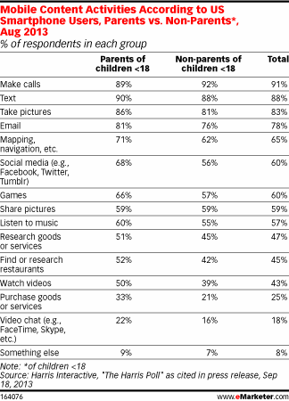 相比不是家长的人群,已为人家长的用户更喜欢买智能的移动设备。接受调查的家长中,70%的人有智能手机,44%的有平板,另21%的有电子阅读器。而尚未成为家长的人群中,拥有智能手机的人仅占47%,29%的人拥有平板,另有16%的人持有电子阅读器。家长也更加热衷于使用移动设备,包括首发信件,玩游戏,社交网络,看视频等。
