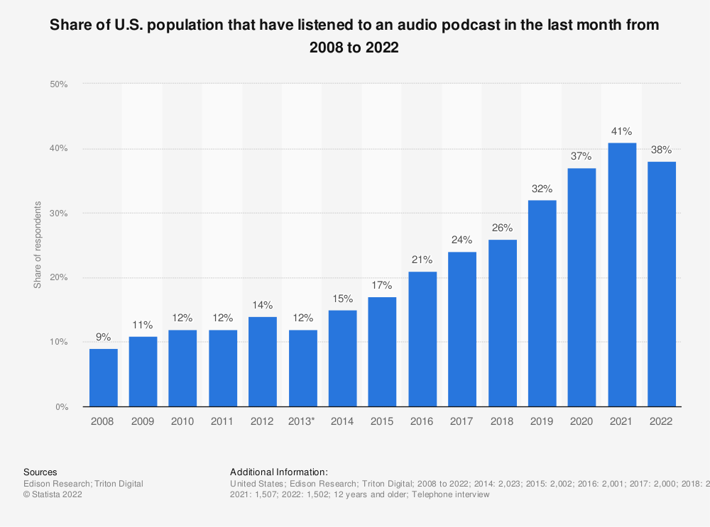 2022年,一项关于播客消费的调查显示,38%的美国成年人在过去一个月内听过播客,这一数字在过去十年中增长了两倍多。每周播客的消费也急剧增长,一些世界领先的播客出版商每月实现了数百万的独立流媒体和下载量。