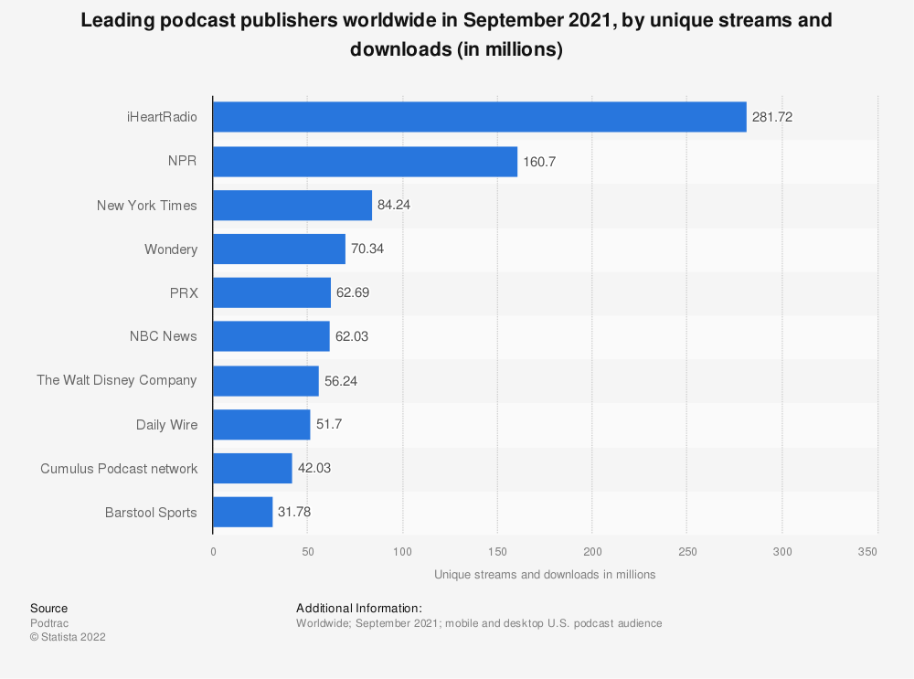 2021年9月,根据独立播放量和下载量计算,全球领先的播客出版商是iHeartRadio,该月的播放量和下载量为2.8172亿次。第二名是国家公共广播电台(NPR),有1.607亿人。
