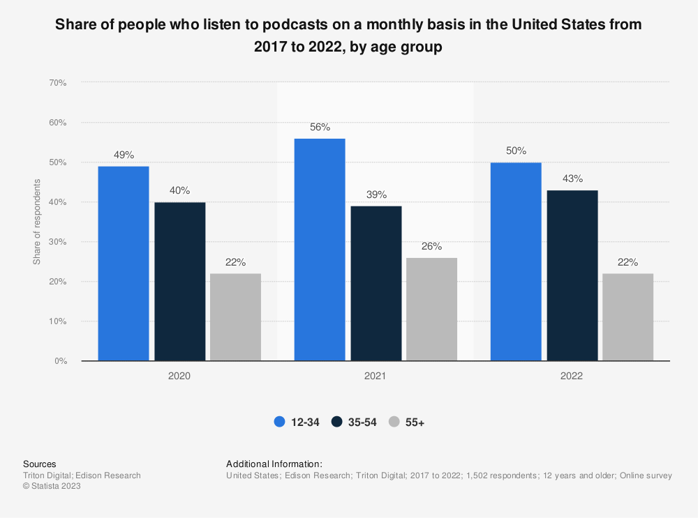 根据2022年初在美国进行的一项调查,12岁至34岁的受访者中有50%的人在上个月听过播客,而55岁或以上的受访者中只有22%的人听过播客。后一个年龄段的成年人多年来一直在增加播客的收听量,在2017年至2021年期间,上个月听播客的人数比例几乎翻了一番。