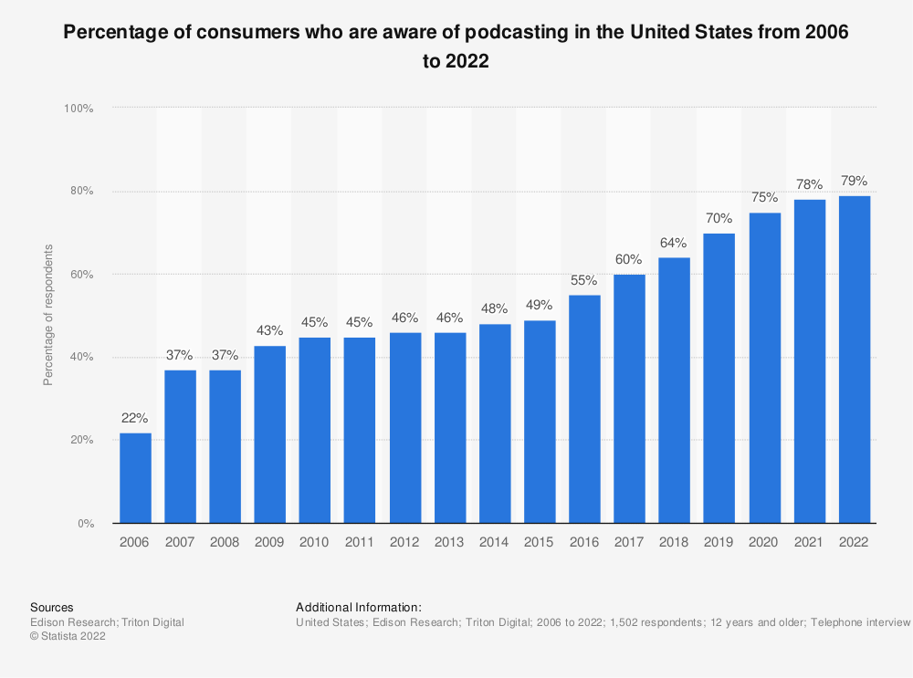 2022年初发布的一项研究显示,12岁或以上的美国消费者中有79%知道播客,比十年前增长了30%以上。几年来,播客越来越受欢迎,在教育、讲故事、采访、建立品牌知名度等方面得到了广泛应用。
