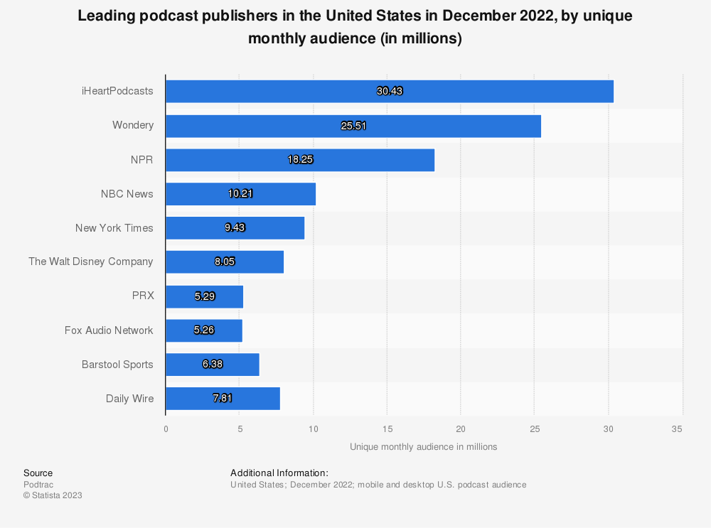 2022年12月,iHeart Podcasts在美国拥有3043万观众。最受欢迎的播客出版商每月的独特受众排名显示,国家公共广播电台以1825万排名第三。去年,Wondery超过了NPR,每月有2551万观众。