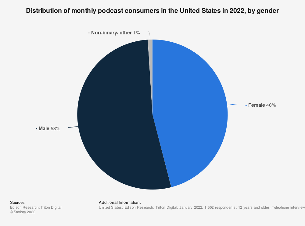 2022年美国每月播客消费者的性别分布 数据来源:Statista.com