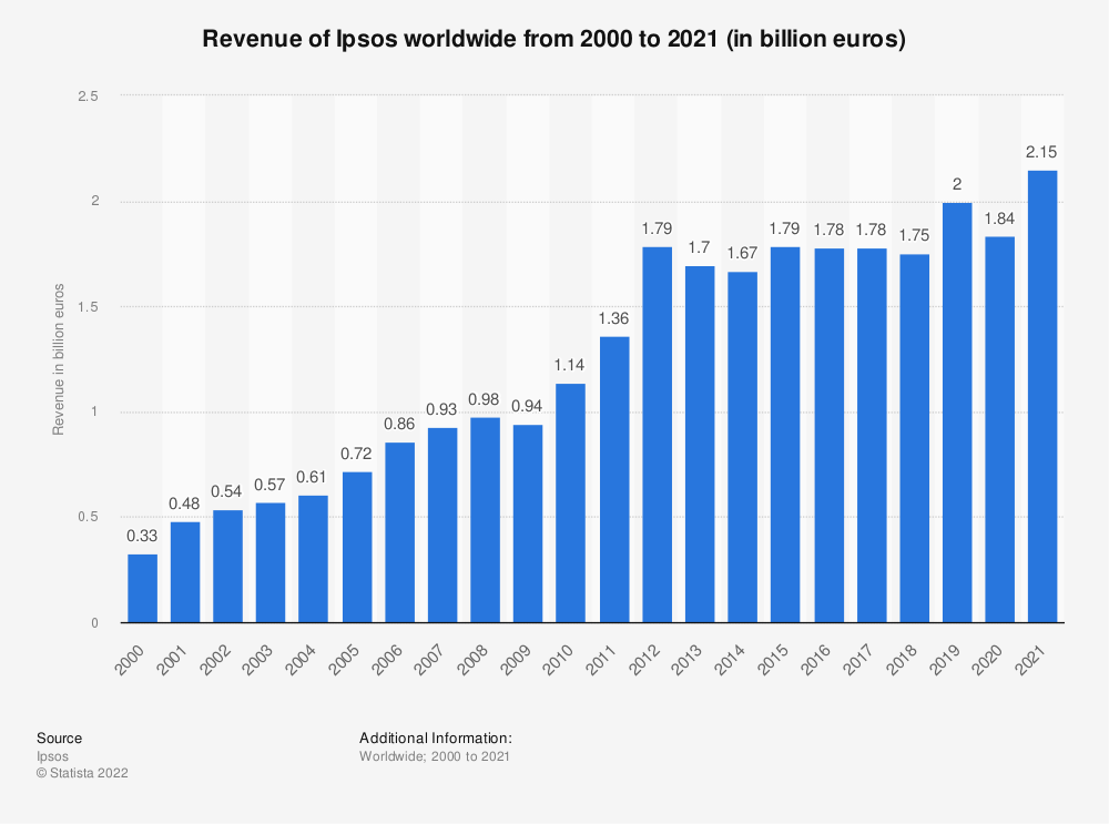 2021年,益普索的收入为21.5亿欧元。这与去年相比有所增加,当时该公司的收入约为18亿欧元。益普索是世界上最大的市场研究公司之一,截至2021年雇佣了近2万名员工。该公司的总部设在法国巴黎。