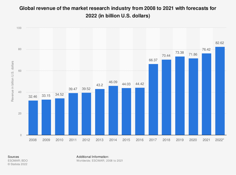 2021年,全球市场调查行业的收入超过了764亿美元,比2008年增长了两倍以上。2020年,北美在市场研究收入中所占份额最大,占总数的54%,其次是欧洲,占23%。全球市场研究行业达到另一个高峰,是从2014年的460.9亿美元到2020年的719亿美元左右。过去10年,全球市场研究行业的表现一直与整体经济趋势相反。此外,2021年的数据表明,收入将增加约45亿美元。