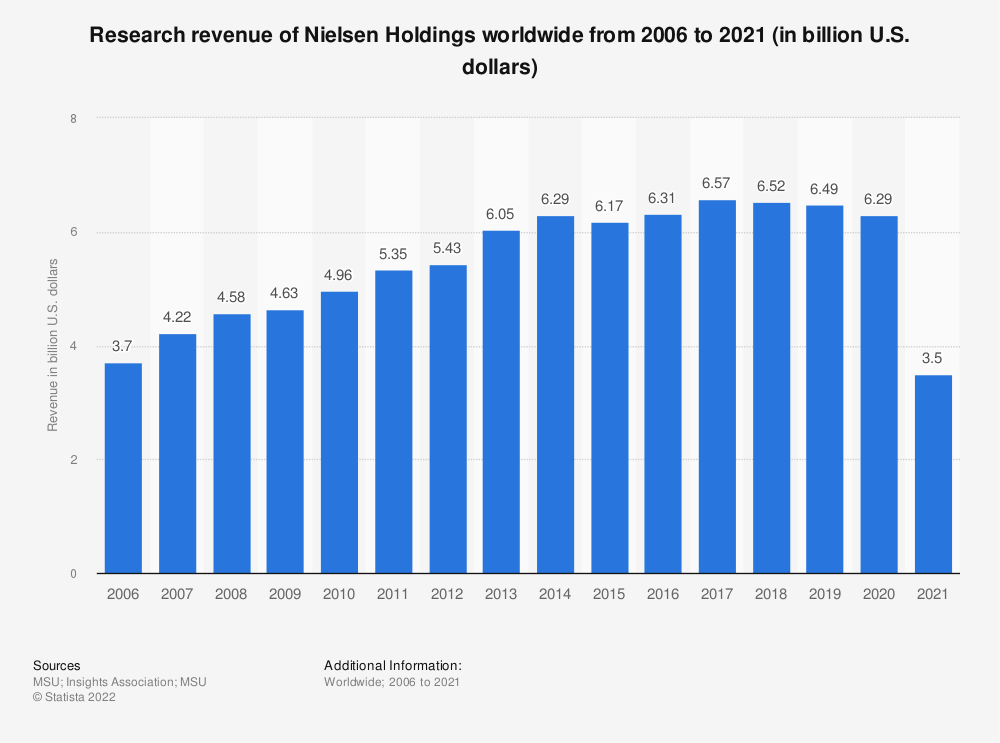 尼尔森控股是美国领先的市场研究公司,也是世界上最大的市场测量公司之一,2021年全球收入接近35亿美元。尼尔森的收入从2006年到2017年稳步增长,达到65.7亿美元的峰值,之后在2018年、2019年和2020年略有下降,然后在2021年大幅下降。