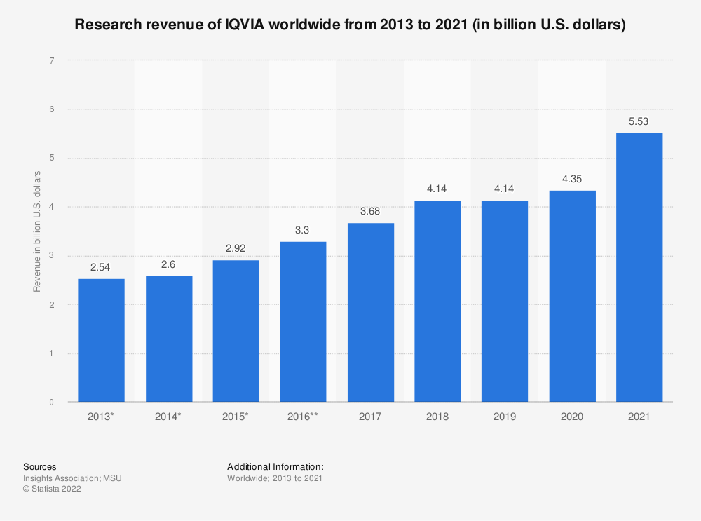 作为全球领先的市场研究公司之一,IQVIA的全球研究收入自2013年以来稳步增长,2021年达到约55亿美元。