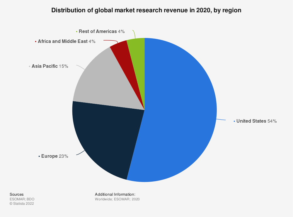 2020年全球市场研究收入分布,按地区划分 数据来源:Statista.com