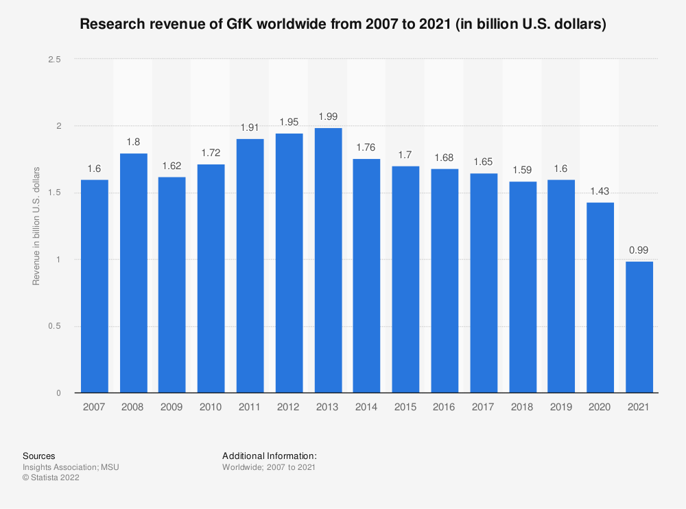 1934年成立的德国市场调查机构GfK集团在2021年的全球总销售额为9亿9000万美元。这一数字与2013年报道的近20亿美元的峰值相比有所下降。