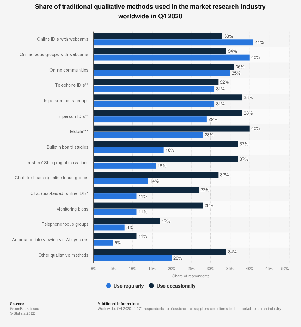截至2020年,网络摄像头的在线深度访谈是全球市场研究行业中最常用的传统定性方法。在调查中,41%的受访者表示,他们经常使用这种方法,这是他们最常用的三种方法之一。