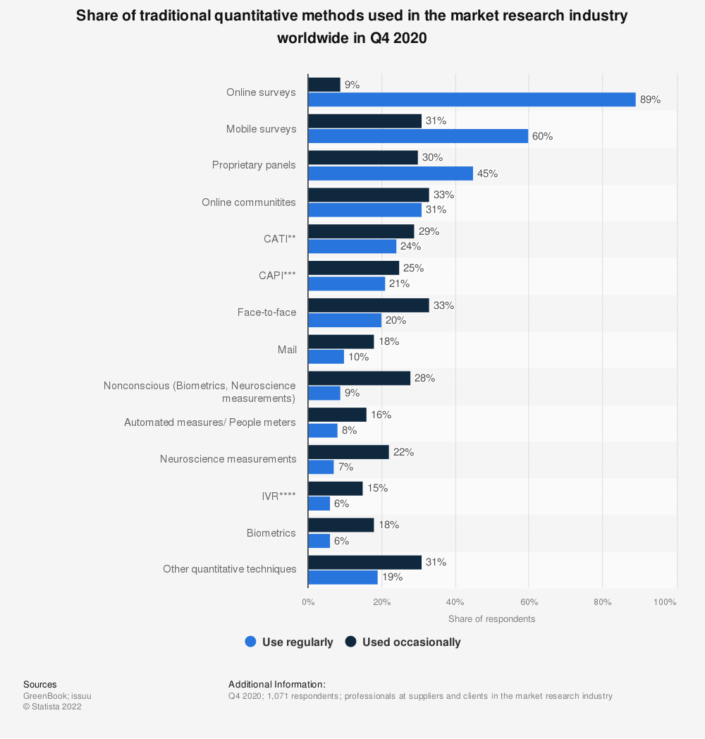 截至2020年,迄今为止,全球市场研究行业中使用最多的传统定量方法只有调查。在调查中,89%的受访者表示,他们经常使用在线调查作为他们最常用的三种方法之一。此外,9%的受访者表示,他们只是偶尔使用在线调查。