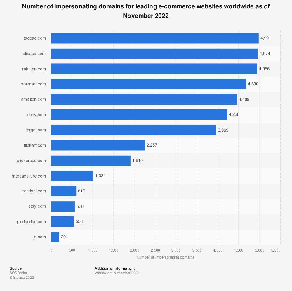 主要的电子商务平台,包括一些世界上收入最高的公司,都是网络各个部分的威胁行为者的完美目标。欺诈者利用合法在线零售商和市场的好名声获利的策略之一被称为“域名欺骗”。它包括创建一个类似于市场上一些最成熟品牌的网站,模仿他们的域名,以获取不知情的客户的访问信息。中国平台淘宝网和阿里巴巴被发现是世界上被冒充最多的电子商务域名之一,它们分别有近5000个假网站。