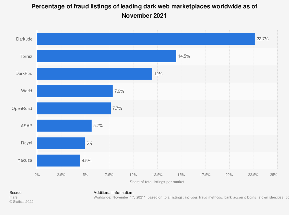 Dark0de是欺诈资源最多的暗网市场之一。截至2021年11月,近23%的商品提供非法产品或服务,涉及欺诈方法、银行账户登录、被盗身份、假币等。在Torrez网站上,欺诈资源占总量的14.5%。