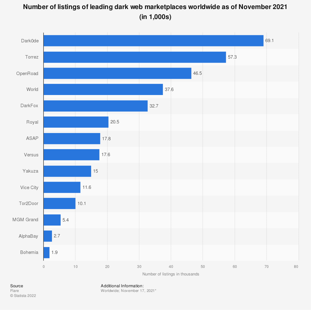 截至2021年11月,Dark0de、Torrez和OpenRoad是上市数量最多的暗网市场。Dark0de提供了超过69100个,而Torrez提供了大约57300个。暗市场是指在暗网上运营的在线市场。