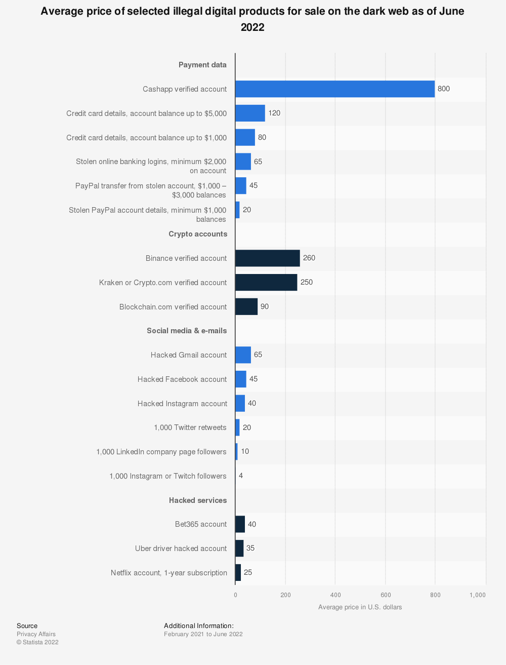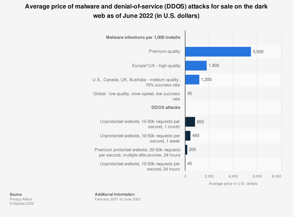 截至2022年6月,暗网上出售的恶意软件和拒绝服务(DDOS)攻击的平均价格(美元) 数据来源:Statista.com