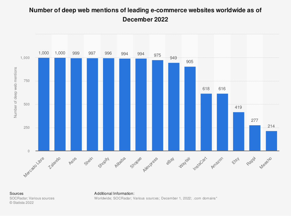 为了运营,电子商务公司将数据库和内部网存储在深层网络上。黑客可能会在这些存储库中发现漏洞,并非法检索私人数据,如管理员登录名,以利用自己或在暗网上销售。截至2022年年底,Wayfair或Aliexpress等公司有超过4000个员工凭证在深网中被泄露。通过跟踪深网对其品牌的提及,电子商务公司可以监控黑客论坛中黑暗代理人的兴趣,并实施应对措施,以防止未来的数据泄露和其他网络安全威胁。