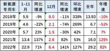 新能源专用车 2021 年市场销量 16 万台,同比增长 125%;2022 年 12 月的新能源专用车市场销量6.4 万台,同比增长 141%,环比 11 月增长 127%。2022 年 1-12 月达到 29.2 万台,同比增长 82%,12 月抢补贴增速较强。